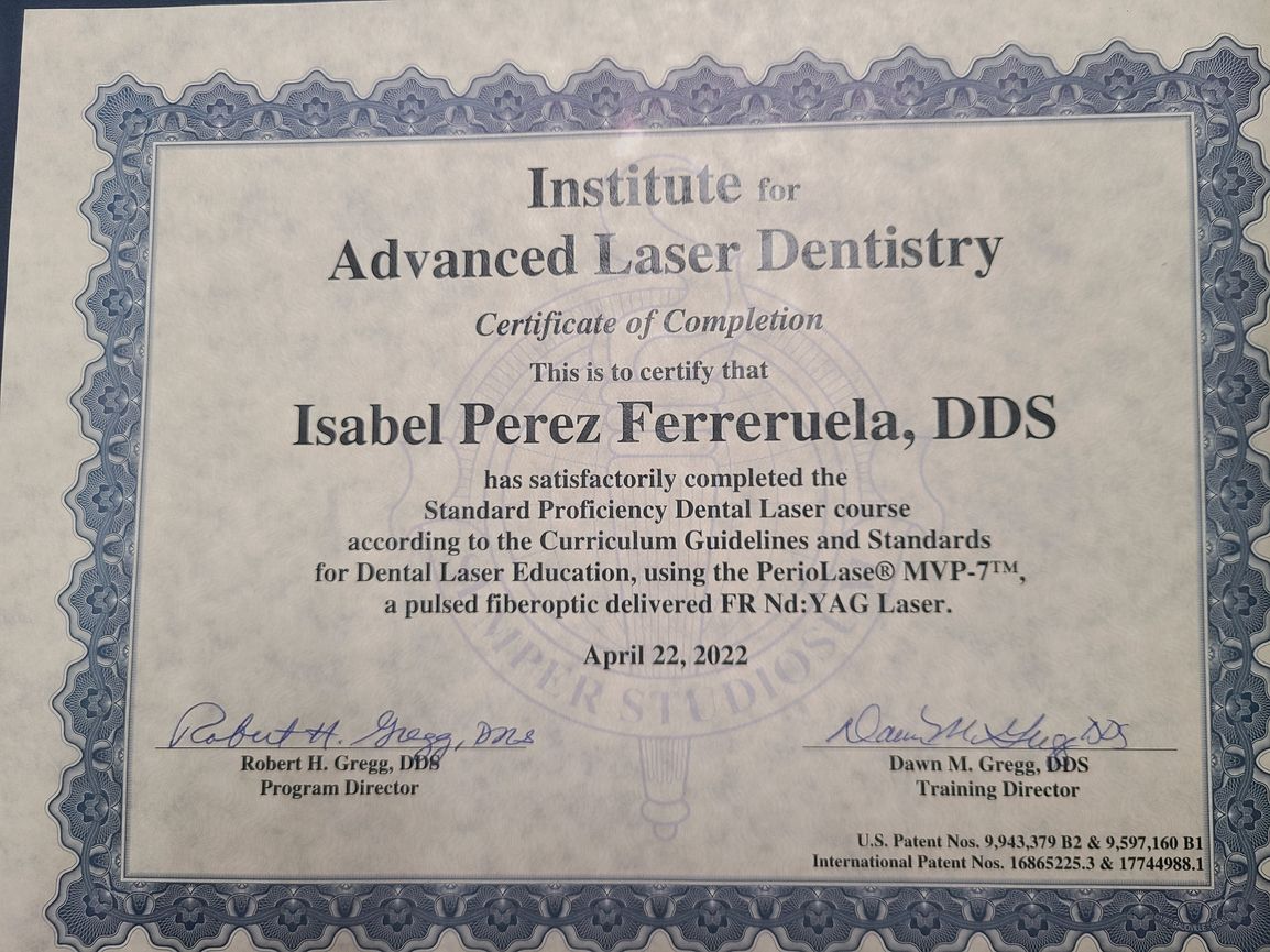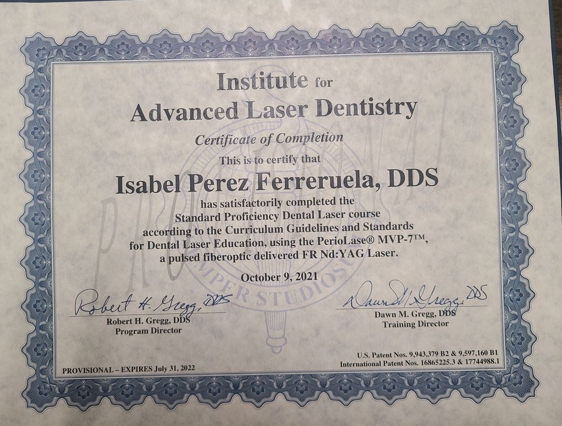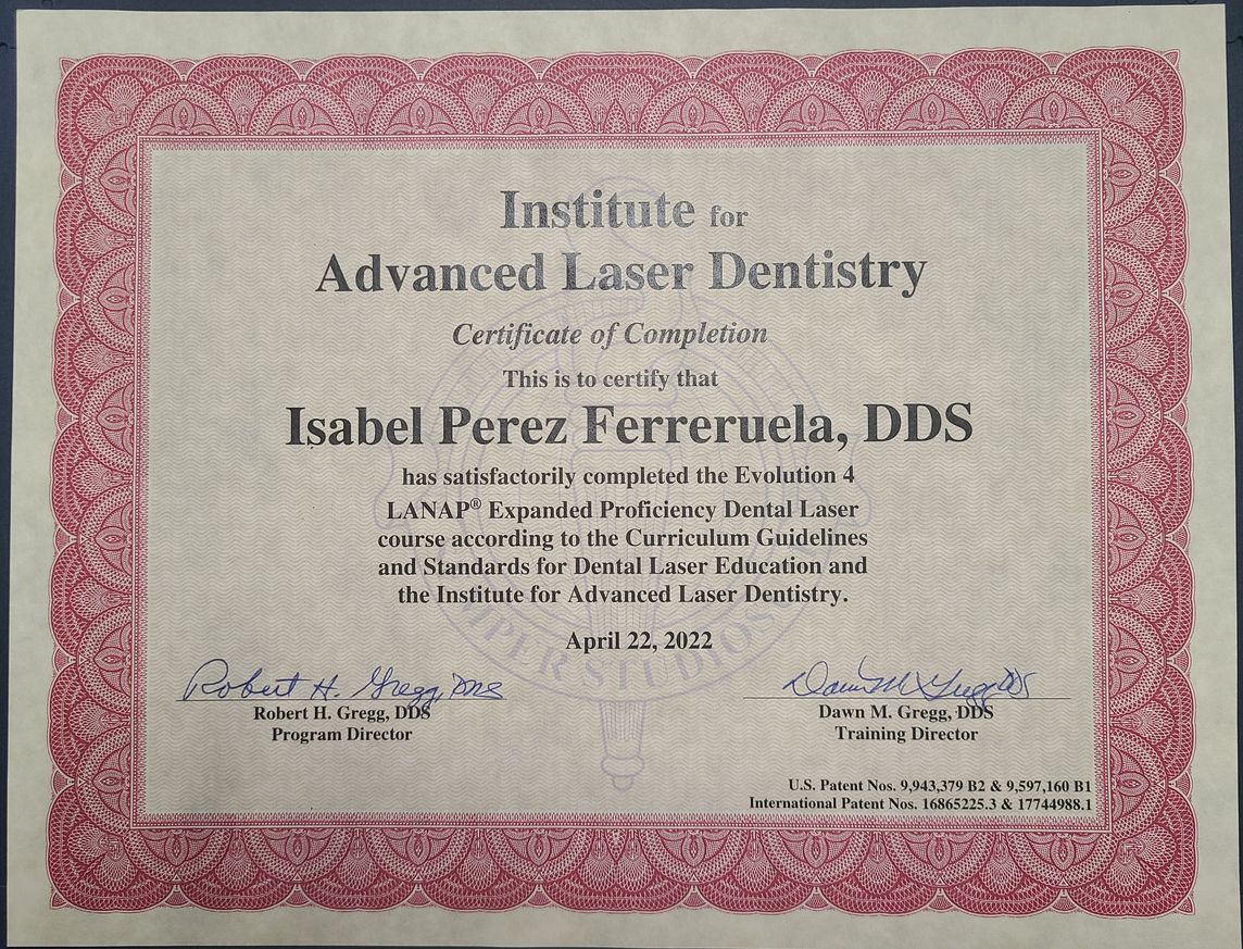 Doctor understands the link between Gum Disease and overall Body inflammation. So she is Certified in the LANAP (Laser Assisted New Attachment Procedure). Which is a surgery to treat moderate to severe gum disease with Laser instead of with a scalpel, achieving new attachment of the gum to the tooth instead of gum loss.