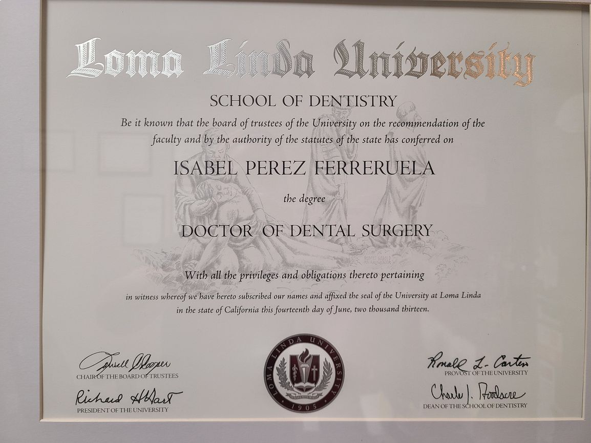 Doctor then moved to the United States achieving the degree of Doctor in Dental Surgery at Loma Linda University School of Dentistry where she graduated with the recognition of the Esthetic Award.